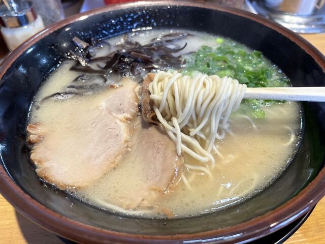 自家製麺(自社製麺)の麺はストレート細麺。一般的な博多ラーメンの麺よりやや加水高めでしっとりとしたなめらかな質感。バリカタでも他店の固め相当でしょうか。伸びにくく啜りやすい良麺です。