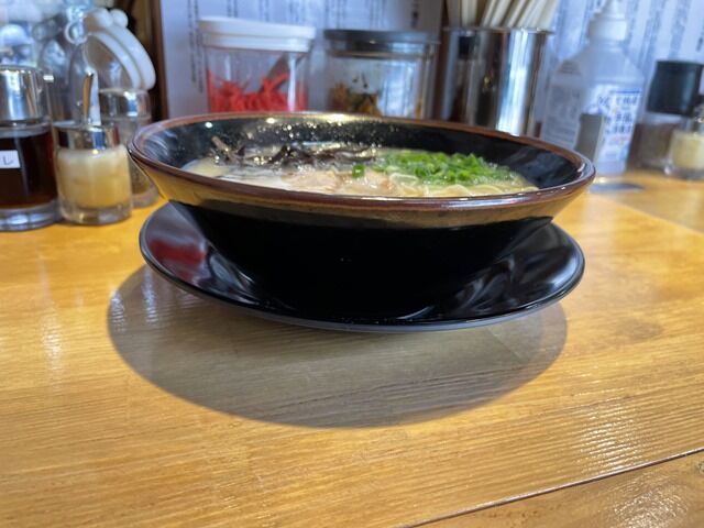 提供が早すぎてカスター類撮影前に到着。黒で揃えられたラーメン鉢が受け皿に乗って着丼。