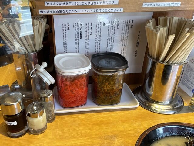BGMはJ-POP、西野カナ「Darling」とか。箸は割り箸。卓上調味料・薬味はらーめんタレ、おろしニンニク、胡椒、すり胡麻、紅生姜、辛子高菜。