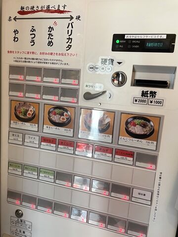 入店するとまず券売機で食券購入です。主なメニューは、とんこつラーメン730円、特製らーめん930円、ばくだん肉味噌100円、替え玉100円、他。ゆで加減をバリカタ・かため・ふつう・やわから指定可能。