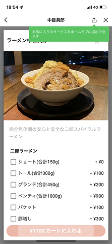 注文画面には「完全無化調の安心と安全な二郎スパイラルラーメン」「二郎ラーメン」とあります。