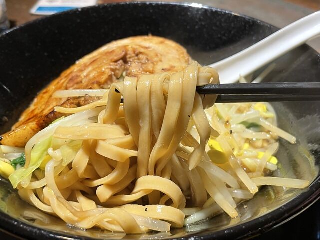 麺は菅野製麺所製のゆるやかにウェーブのついた平打ち太麺。ムチムチ麺の存在感が凄くて汁なしパージョンで食べてみたくなるそんな麺でした。