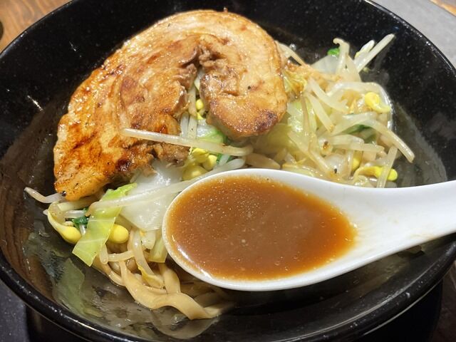 スープはさらりとした豚骨醤油味。これぞ無化調醤油スープ的な二郎系では抜きん出たあっさりさ。背脂投入でギアチェンジはマスト。シンプルでブレーンな味なので、味変ツールの効果は絶大。マヨに粉チーとタバスコで洋風シフトも楽しめます。カスタマイズの振り幅が絶大な一杯でとても美味しい!