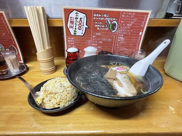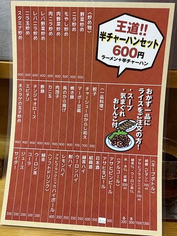 券売機はなく後会計制。基本タカノを踏襲ですが、なんとさらに値下げ。ラーメンなんと400円というコンビニチルド麺より安価。タカノ深夜帯の名物チャーハンもこちらで復活。「王道!!半チャーハンセット(ラーメン+半チャーハン)」600円と、学食かという安さ。