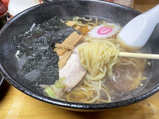麺は町中華ラーメンのチュルチュルと啜れる玉子麺風の中細縮れタイプ。いかにも頼りない感じがしますが、だがそれがまたいい味出してます。