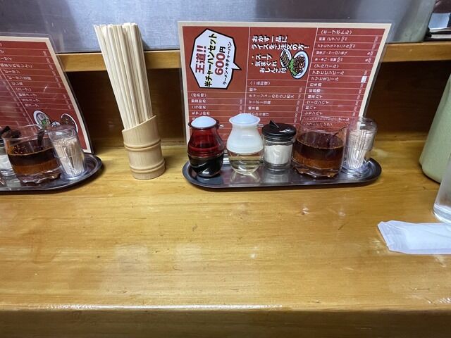 スタッフは金髪でダウンタウンの松ちゃんにちょい似の店主さん、方を庇いながらも全力の中華鍋振り。調理サポートは、やはりタカノで一緒だった若い茶髪くん。ホール担当女性の3名体制。BGMは無し。箸は割り箸。卓上調味料は醤油、酢、白胡椒、ラー油。