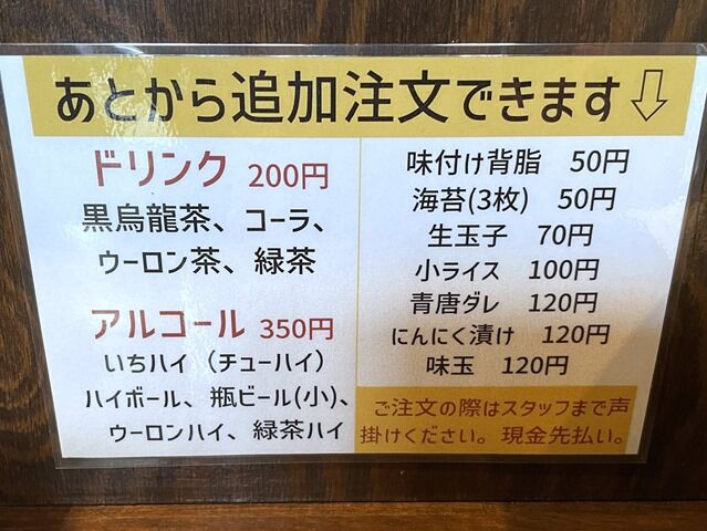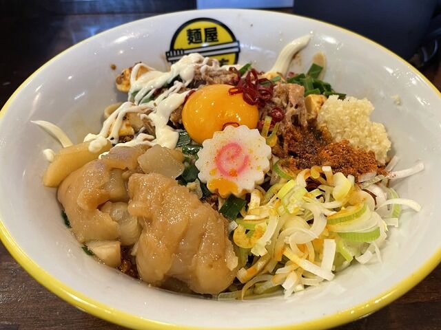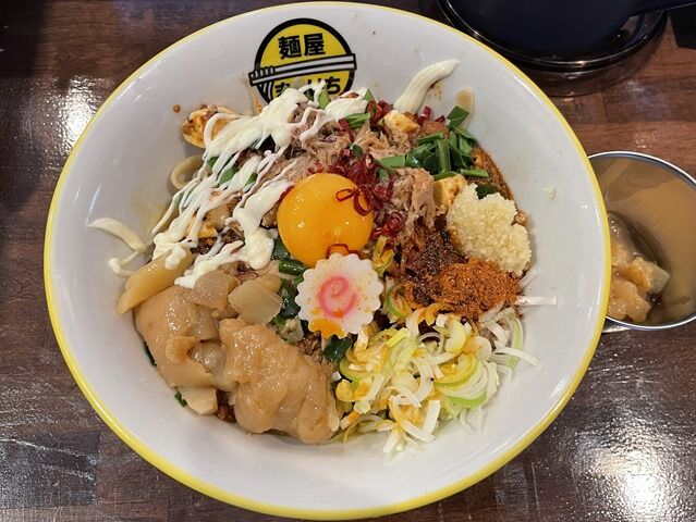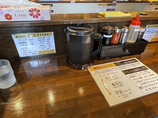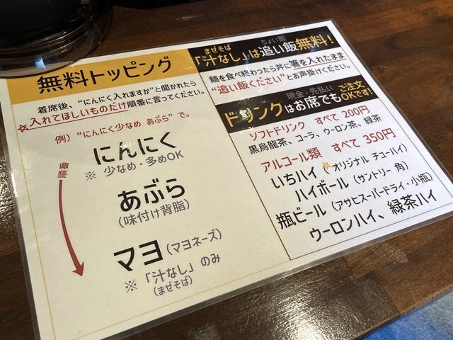 無料トッピングは、にんにく、あぶら(味付け背脂)、マヨ(汁なしのみ)。あぶらは別皿可能。コールのタイミングは食券回収時。麺少なめ対応可能ですが、味のバランス具崩れるため、残しても良いのでそのままがお勧めとのこと。