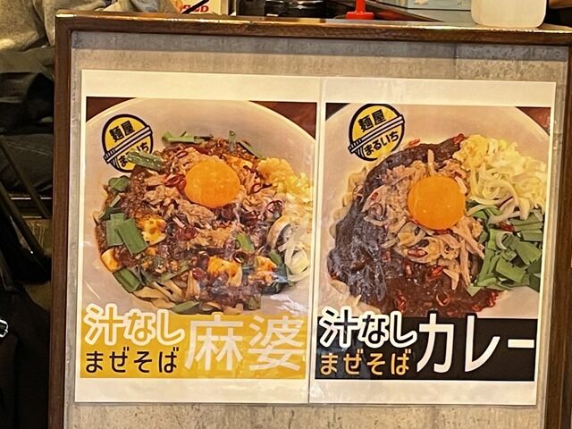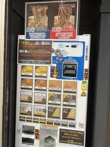 入店前にまず店外店頭券売機で食券購入です。主なメニューは、汁なし麻婆900円、汁なしカレー900円、つけ麺900円、ミニ麻婆丼350円、ミニカレー丼350円、他。