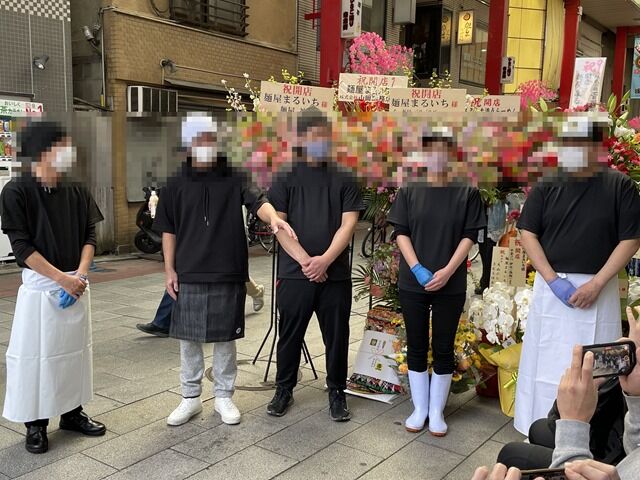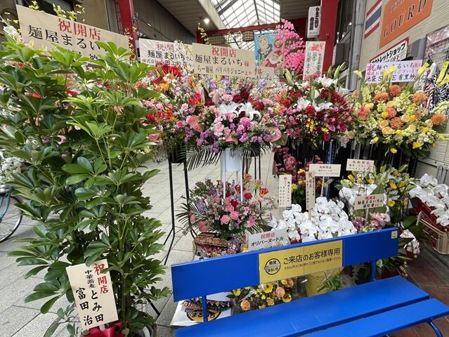 店頭にはおびただしい数の開店祝花。麺屋神工、らー麺屋バリバリジョニー、中華蕎麦とみ田、中華ソバ伊吹、ラーメンきずな、他から。