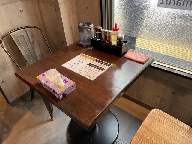BGMは懐かしのJ-POPとポップスのミックス。J-POPは、あゆのSEASONS、ELTのTime goes byなど♪箸は割り箸。卓上調味料は、カエシ、一味唐辛子、黒胡椒、リンゴ酢。