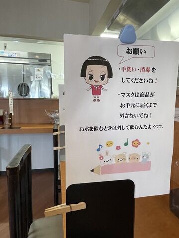 店内は厨房前に逆L字型カウンター5席(2・3)、4人卓x1、2人卓x2。カウンター1席ごとにアクリル板の仕切り設置。消毒液は各席に配置。