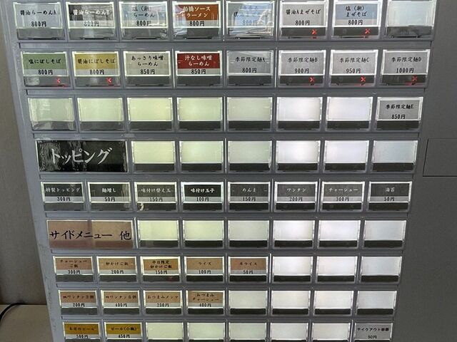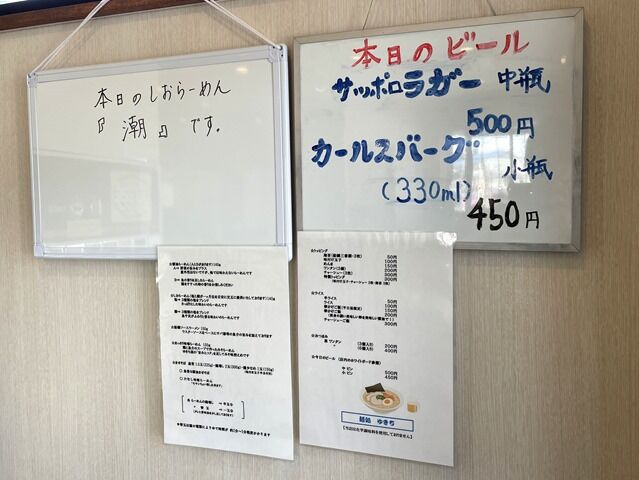 主なメニューは、醤油らーめんA、醤油らーめんB、塩(潮)らーめん、船橋ソースラーメン、魚香る醤油まぜそば、醤油Aまぜそば、塩(塩)まぜそば、塩にぼしそば、醤油にぼしそば 各800円、あっさり味噌らーめん850円、汁なし味噌らーめん850円、他。