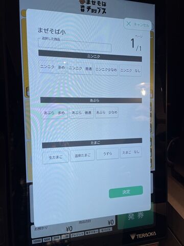 ニンニクの量、アブラの量、たまごの種類(生、温玉、うずら、なし)を券売機で選択。