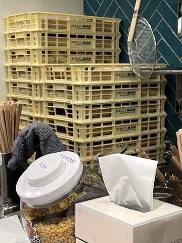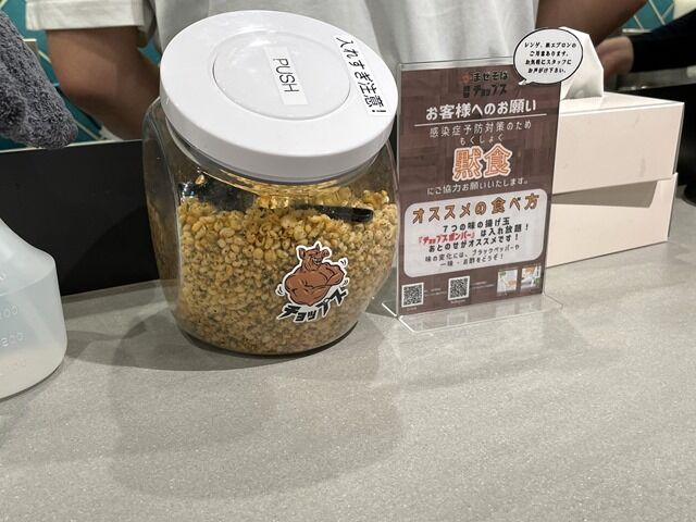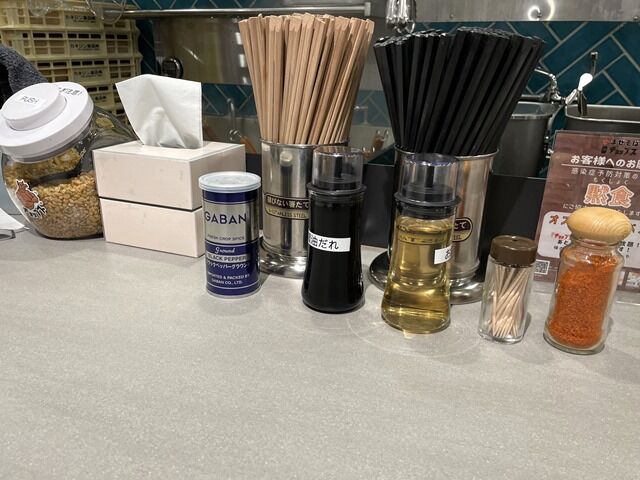 BGMはポップス。箸は洗い箸と割り箸のW装備。卓上調味料はGABANブラックペッパー、酢、一味唐辛子、チャップスボンバー(7つの味の揚げ)玉。