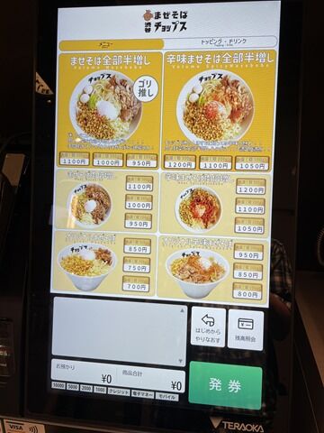 入店するとまずタッチパネル式券売機で食券購入です。主なメニューは、まぜそば全部半増し1000円、辛味まぜそば全部半増し1100円、まぜそば肉倍増し1000円、辛味まぜそば肉倍増し1100円、オリジナルまぜそば750円、オリジナル辛味まぜそば850円、他。
