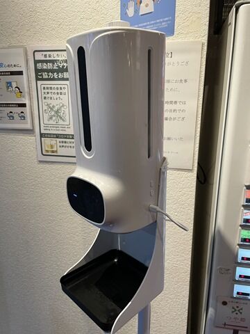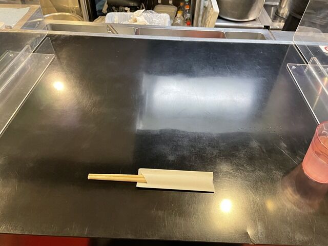 店内は厨房前に真っ直ぐなカウンター7席、奥にテーブル席。カウンター1席毎にアクリル板の仕切り設置。消毒液は券売機横に自動噴霧器配備。