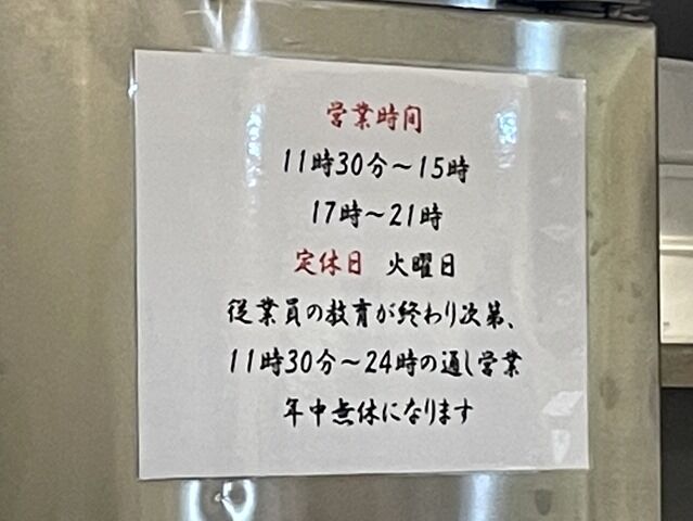 営業時間は11:30~15:00 17:00~21:00、火曜日定休。スタッフの教育が終わり次第11:30~24:00年中無休へシフト。