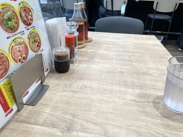 BGMはJ-Pop、We can't stop the music、他。箸は店名ロゴ入り紙袋に入った割り箸。卓上調味料はS&B一味唐辛子、ミル入り粒黒胡椒、酢、ラー油。