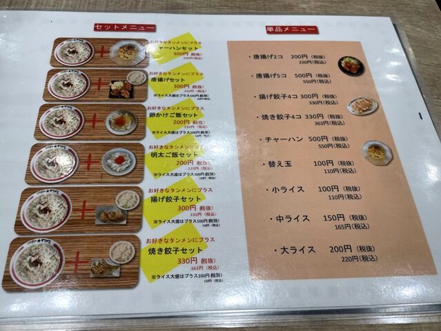 券売機はなくメニューを見て注文。椅子の背もたれの枠に掛けた伝票方式、食後レジにて後会計制。主なメニューはタンメン549円、野菜たっぷりタンメン659円、特製タンメン989円、チャーハンセット・唐揚げセット+330円、卵かけご飯セット・明太ご飯セット+220円、他。