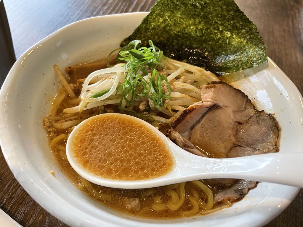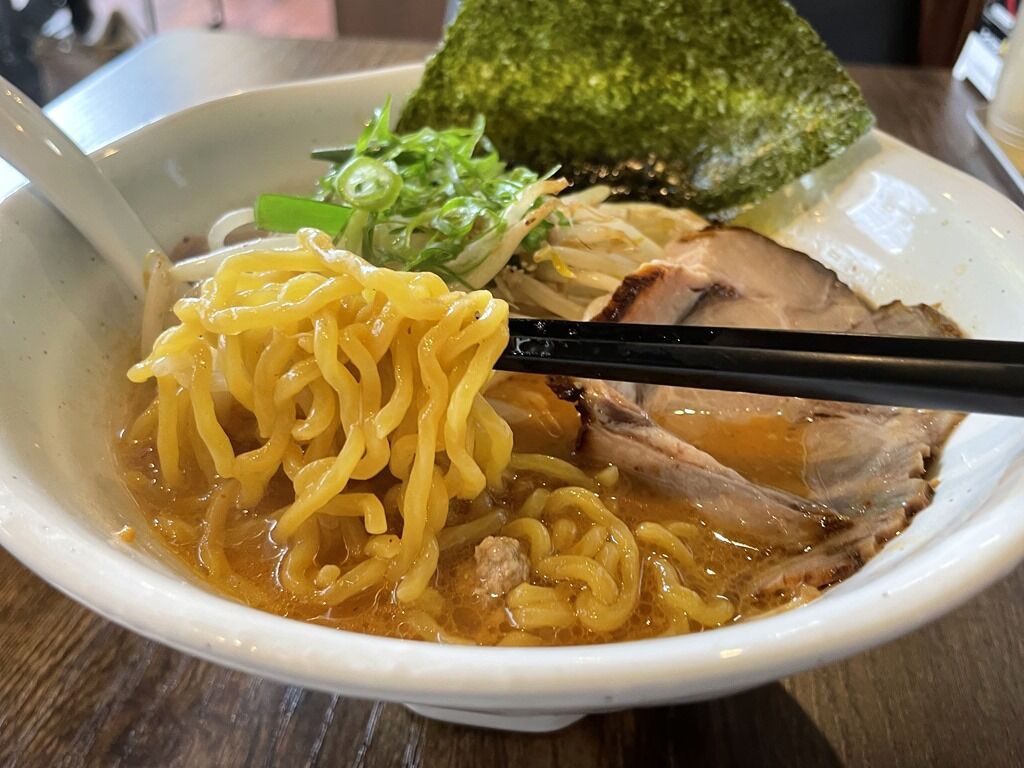 スープはさらりとした白湯味噌味。味噌味濃いめで、輪郭のはっきりとした旨味がビビットに伝わるキレのある味わい。ただ、サービスライスと一緒が前提のためか、ややしょっぱ目。まあこのあたりの加減は好みの範疇で、また酷暑の日にはいいかも。中華鍋を振って作るサッポロスタイルの王道の味噌ラーメンらしい一杯で、とても美味しい!