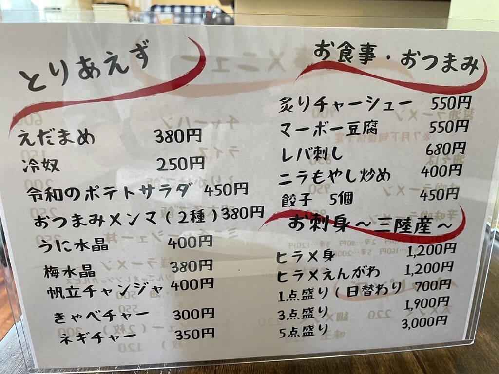 醤油ラーメンは7月27日から発売開始。ランチタイムはライスorふりかけご飯サービス。夜は三陸産刺し身等おつまみ多数取り揃え。