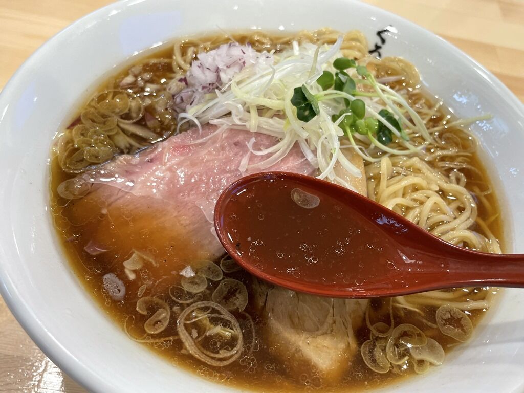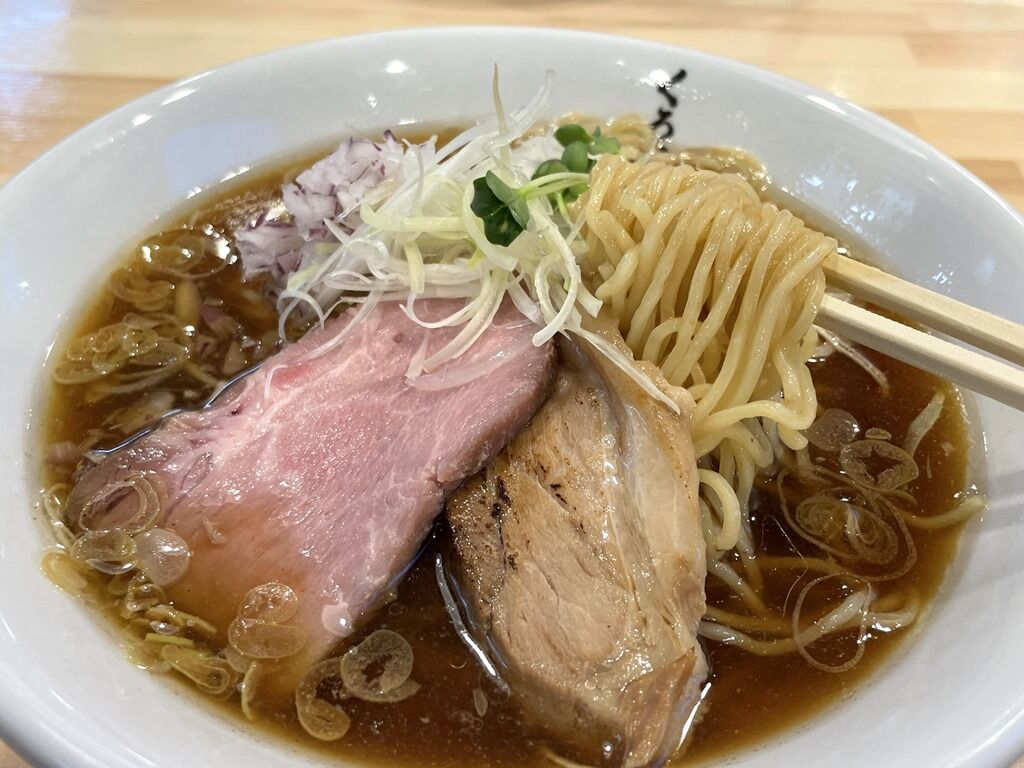 スープはさらりとした清湯醤油味。カタクチイワシの出汁に豚骨と香味野菜を合わせた煮干しスープ。仕上げに背脂をちゃっちゃとたっぷり。ニボ過ぎない食べやすいほどほどの煮干し感に、くどさを感じない上質な背脂がまろやかなコクと甘さをプラス。煮干しが苦手な方でも行けそうなマイルドライトな煮干しテイストでとても美味しい!
