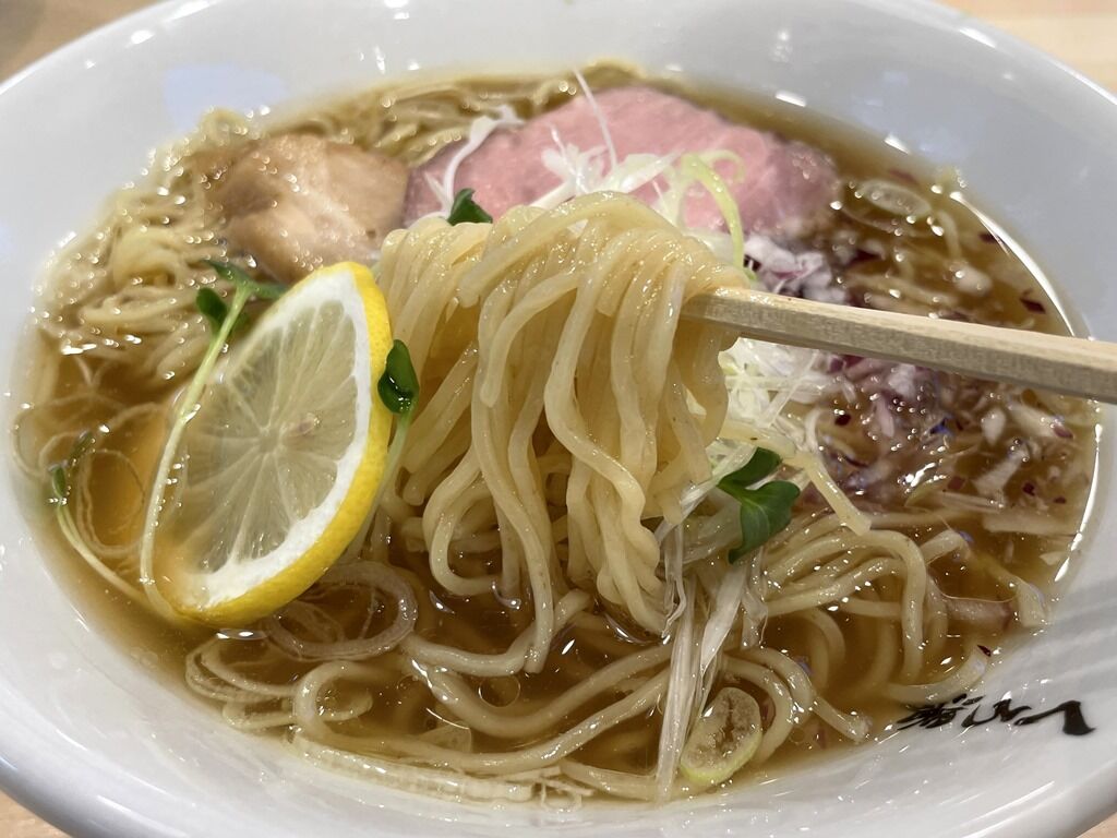 スープはさらさらの清湯塩味。すっきりさっぱり軽い煮干し塩味。レモンの酸味が爽やかさをさらにレベルアップ。塩も旨いです。
