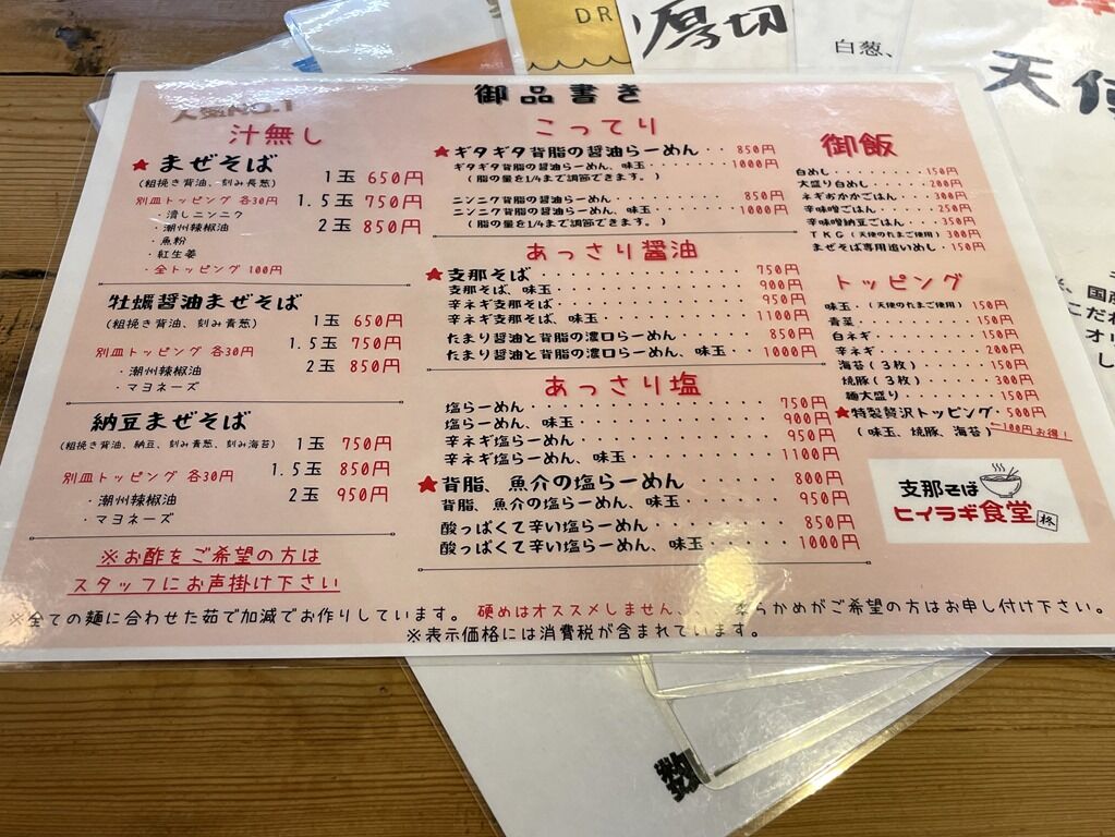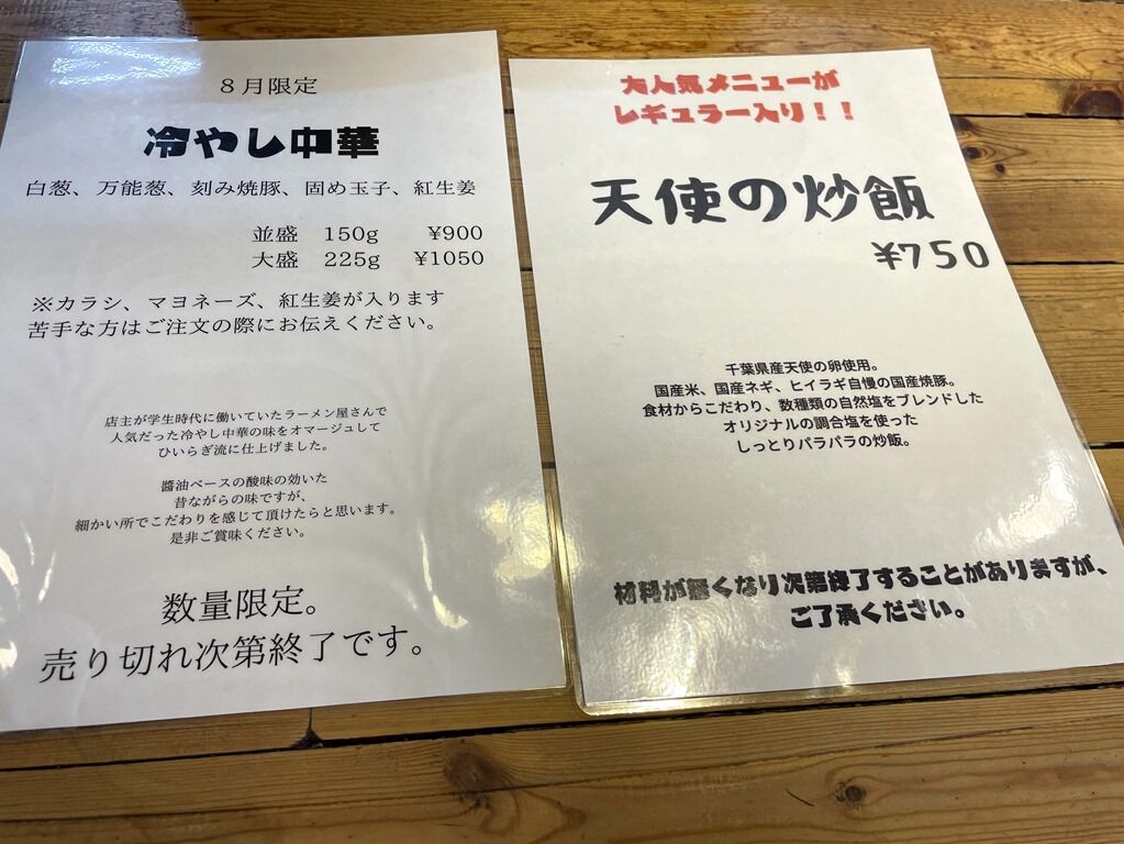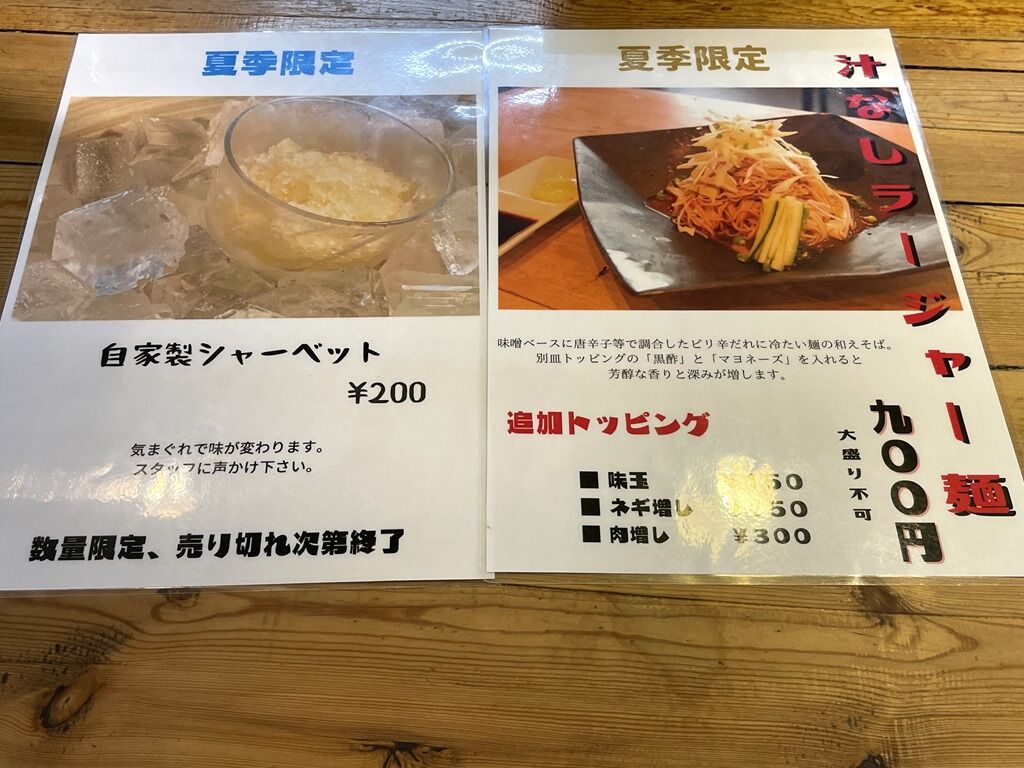 夏季限定は汁なしラージャー麺900円、自家製シャーベット200円、8月限定冷やし中華900円、数量限定天使の炒飯750円、気まぐれ限定のごはんもラインナップ。