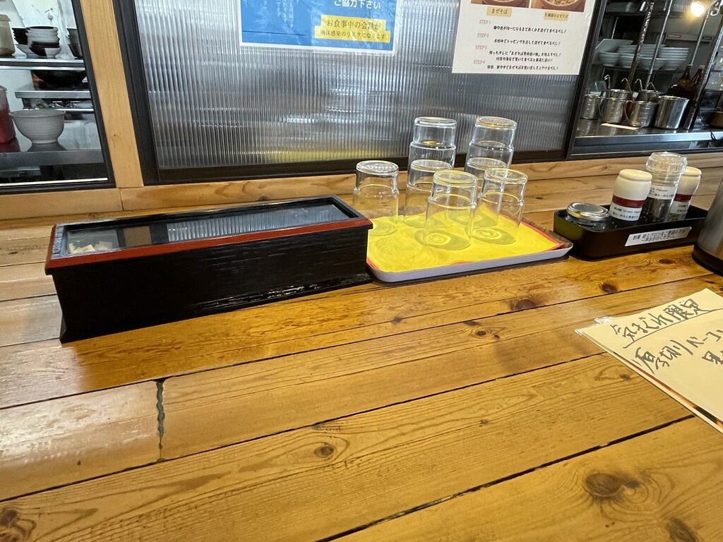店内は厨房前に真っ直ぐなカウンター8席、8人卓x2。カウンター2席毎にアクリル板の仕切り設置。消毒液は入口入ってすぐ左の棚に配置。
