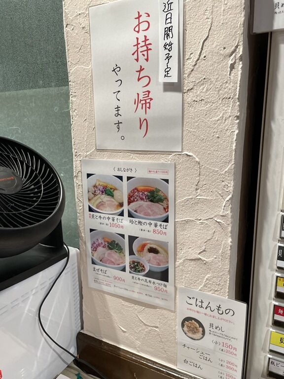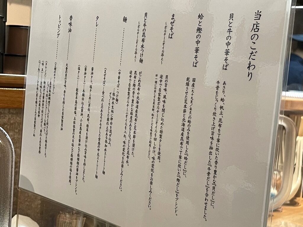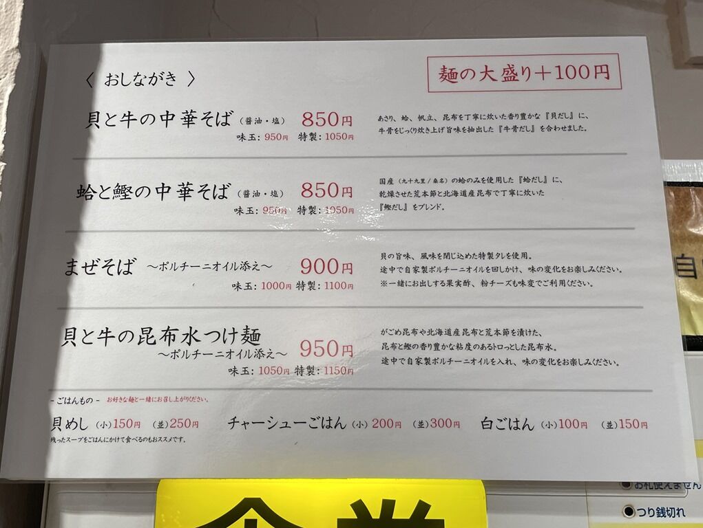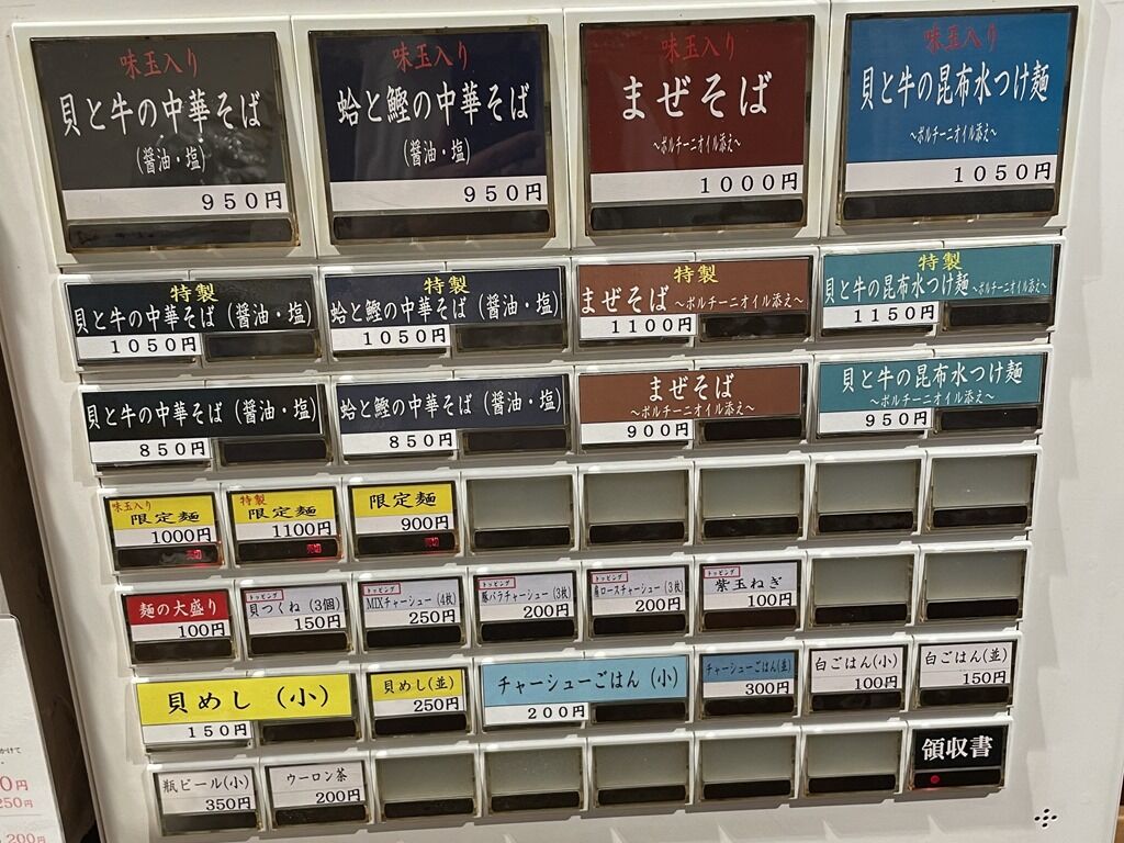 蕎麦たつ等の跡地。なんでこんな場所にってロケーションに、忽然とラーメン屋さんが出現って感じ。入店するとまず券売機で食券購入です。主なメニューは、貝と牛の中華そば(醤油・塩)850円、蛤と鰹の中華そば(醤油・塩) 850円、まぜそば〜ポルチーニオイル添え〜1000円、貝と牛の昆布水つけ麺〜ポルチーニオイル添え〜1050円、貝めし小150円、チャーシューめし小200円、他。