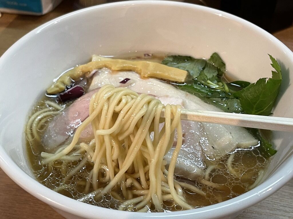 麺はストレート中細タイプ。生地に卵白を混ぜ込んだという低加水タイプ。さっくりとした食感か貝のスープに良くマッチ。