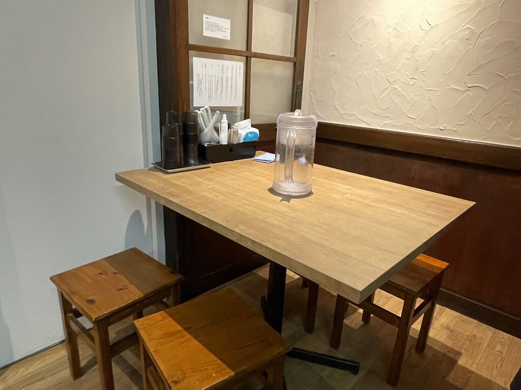 入口から厨房までの壁沿いに、壁に向かったカウンターが設置されてますが、訪店時未使用で奥のカウンターとテーブルのみで営業。