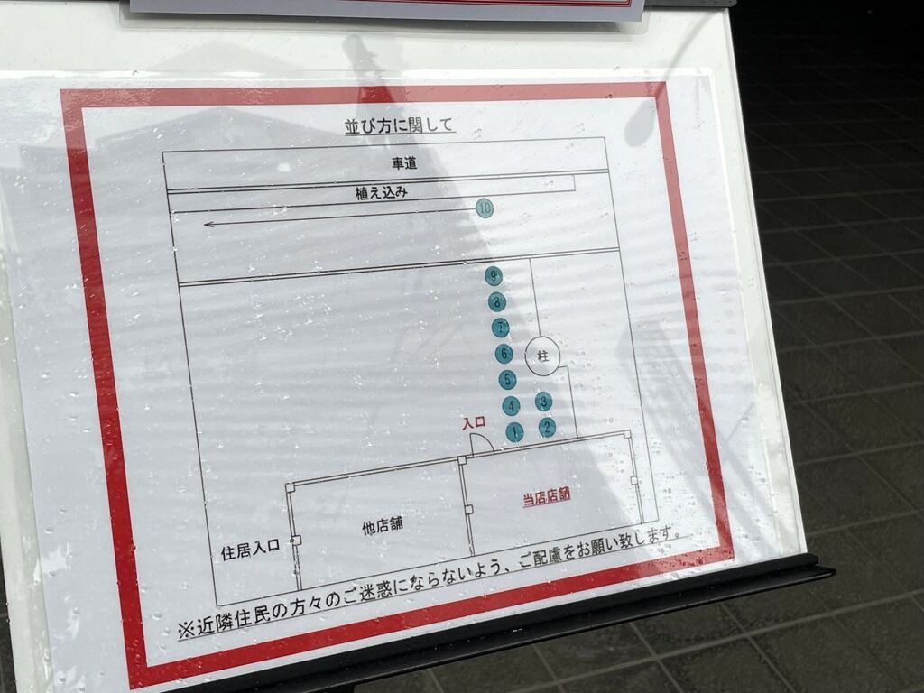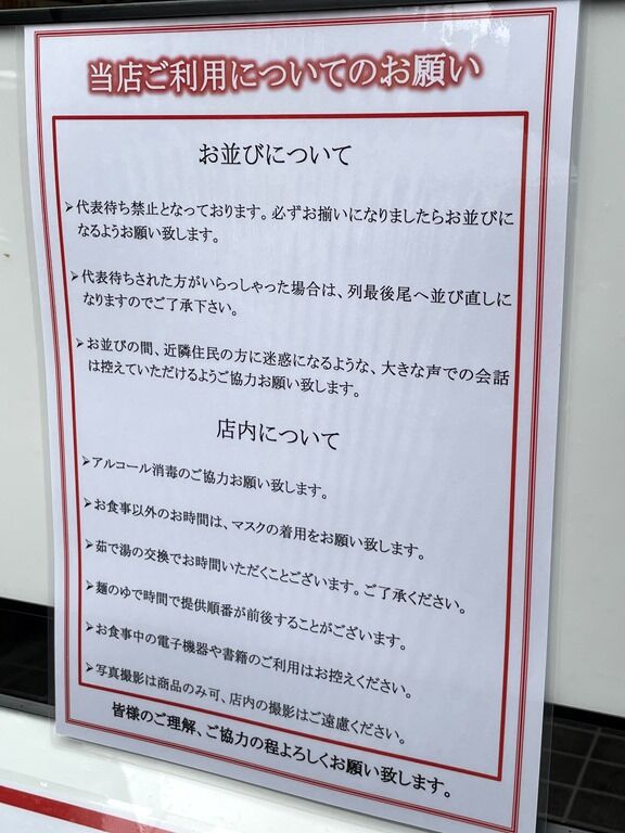 店内は入口入って右手に券売機、左にガラス張りの製麺室。券売機横製麺室前に待ち椅子3脚。奥へ進むと左手が厨房で、厨房前に真っ直ぐなカウンター9席(3・間・6)。カウンター1席毎にアクリル板の仕切り設置。消毒液は券売機横に自動噴霧器配置。スタッフは店主さんと、初日に続きヘルプにとものもと店主夫妻。BGMはヒーリングミュージック。箸は竹の割り箸。卓上調味料は無し。