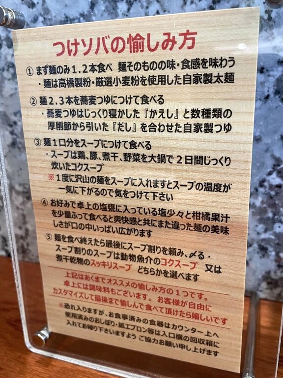 卓上メニュー立て「つけソバの愉しみ方」によると、①まずは何もつけずに麺をそのままで、②麺を蕎麦つゆにつけて、③麺をスープにつけて、④塩と柑橘果汁をふって、⑤スープ割りというフロー。
