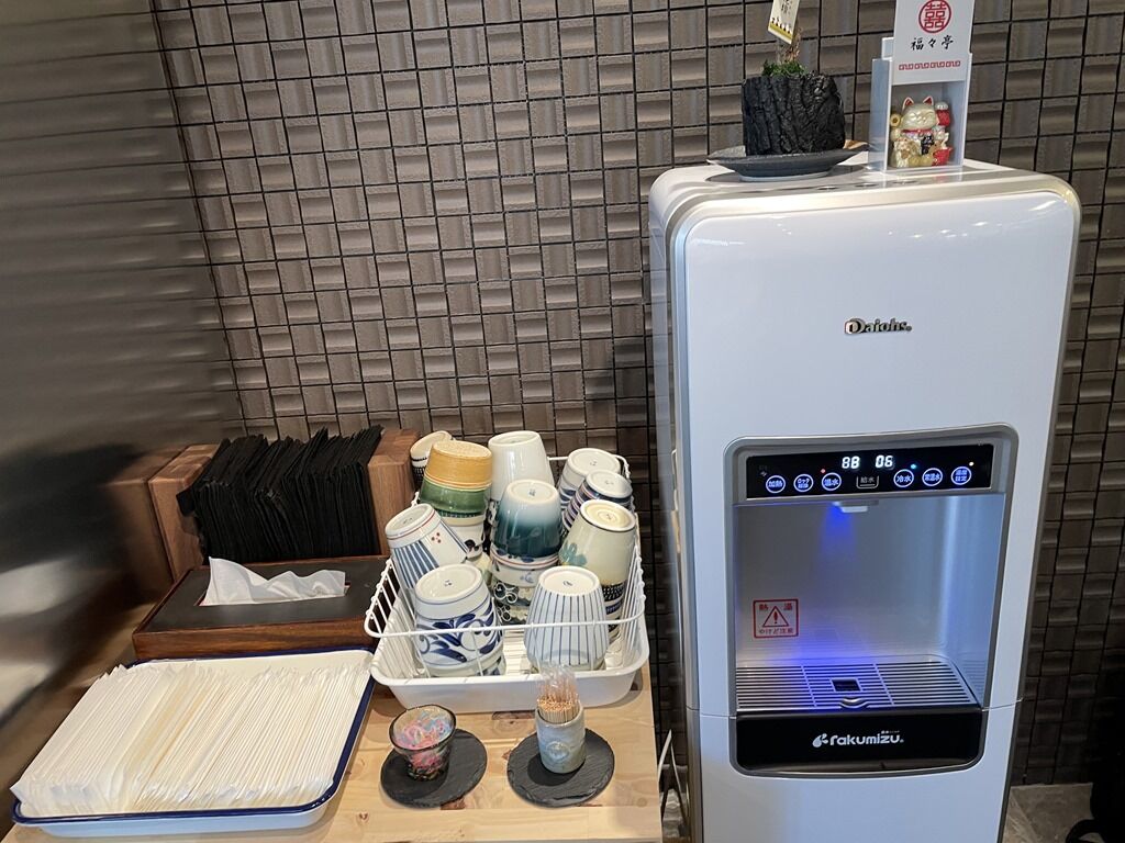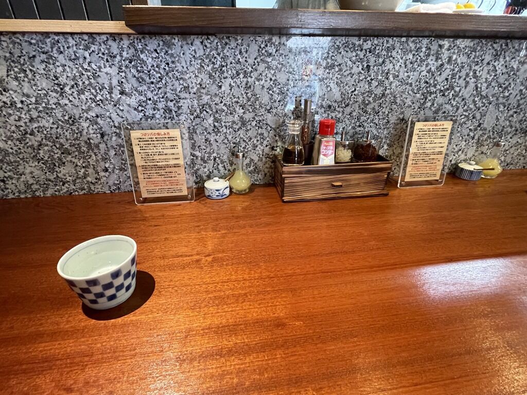 スタッフは店主さんと女性の2名体制。BGMはTBSラジオ。箸は洗い箸で資源環境に配慮。卓上調味料は塩、柑橘果汁、酢、プッシュミル入り山椒、S&Bテーブルコショー、ニンニク、辛味調味料。
