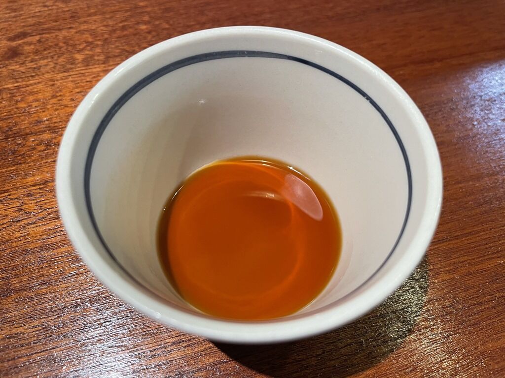 一通り食べ終えたらスープ割り。割りスープは動物魚介のコクスープまたは、煮干乾物のスッキリスープから選択。また、スープの量を調整するかそのままで良いか聞かれます。さらに、柚子を入れてよいかどうかも。選んだのは「煮干乾物スッキリ・スープ量はお任せで調整・柚子有り」。グランドフィナーレまで美味さで口奮と感動が続きます。