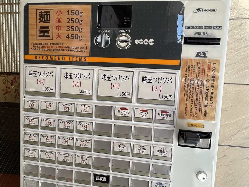 到着時まだシャッターが閉まってましたが、定刻15分程前にシャッターオープン。約12分前券売機起動。先に食券を買うように案内があり、店外店頭券売機前へ。主なメニューは、つけソバ950円、味玉つけソバ1050円、メンマつけソバ・チャーシューつけソバ1200円、メンマ&チャーシューつけソバ1450円、他。