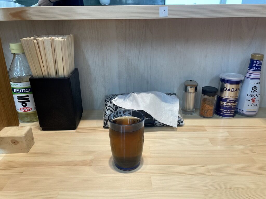 BGMはJ-POP、ミックスナッツ、カメレオン、他♪箸は割り箸。卓上調味料は、ミツカン穀物酢、一味唐辛子、GABANブラックペッパー、キッコーマンしぼりたて生しょうゆ。お冷代わりは冷たいウーロン茶。