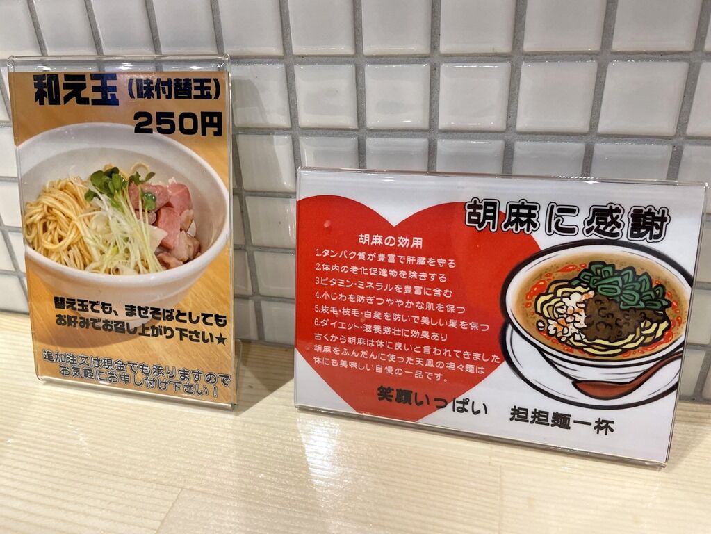 入店するとまず券売機で食券購入です。主なメニューは、汁なし担担麵950円、担担麺950円、中華ソバ850円、チャーマヨご飯300円、ポルチーニ香るTKG250円、和え玉250円、他。