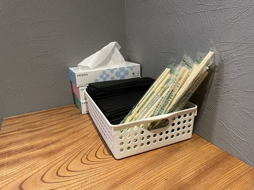 厨房出入り口側の横に製麺機が設置された製麺スペースあり。待ち席横にティッシュ、紙エプロン、割り箸のコーナーあり。