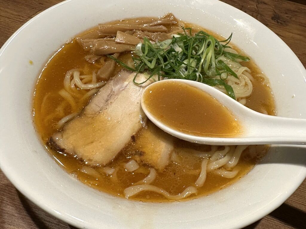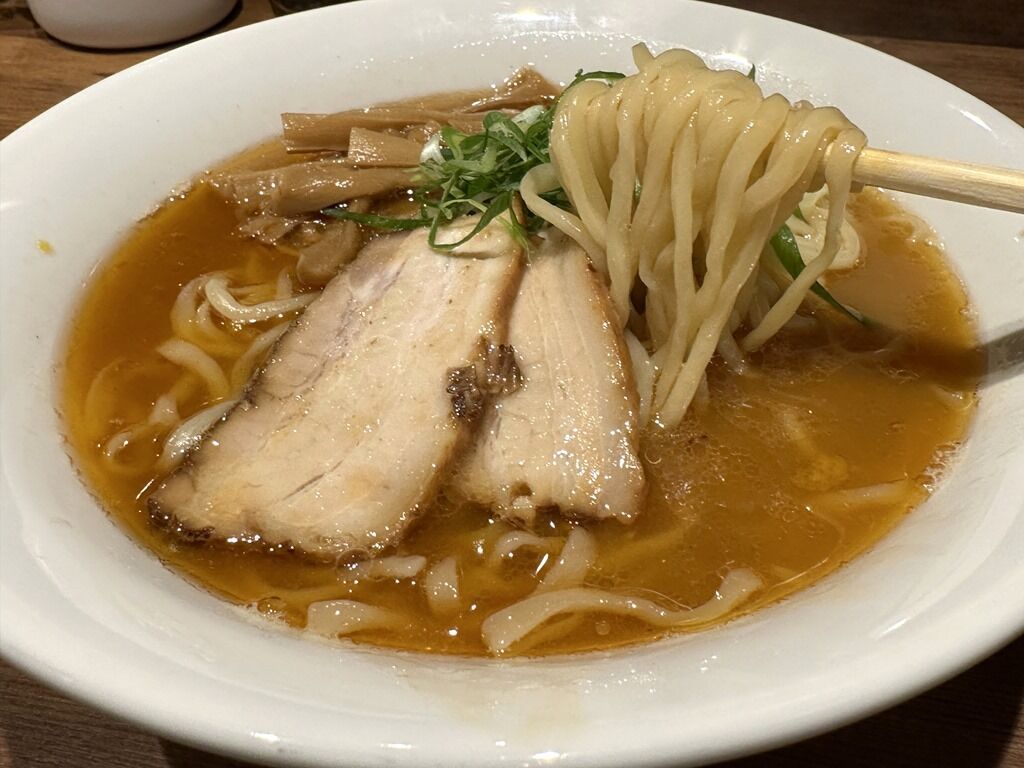 スープはさらさらの清湯醤油味。香味油が海老油!?エビ香るスープですが出汁は動物性メインの模様。サラッとしつつ旨みたっぷり。出身店はもちろんどことも似ていないオリジナリティあふれるユニークで独創的な味ですごく美味しい!