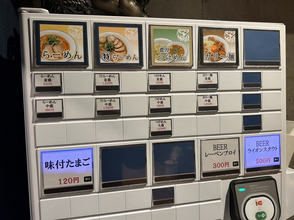 入店するとまず券売機で食券購入です。主なメニューは、らーめん930円、濃厚つけ麺930円、カリー麺1150円、他。価格は並盛の場合。武蔵で人気だったカリー麺が久々の復活。武蔵出身者は「ら〜麺」の表記が多いですが、こちらはオリジナルで。
