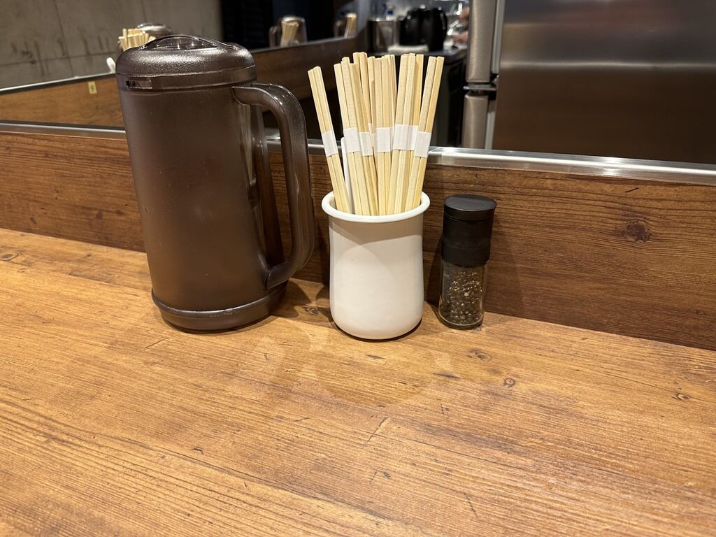 BGMはフュージョン。箸は割り箸。卓上調味料はペッパーミル入り粒黒胡椒。