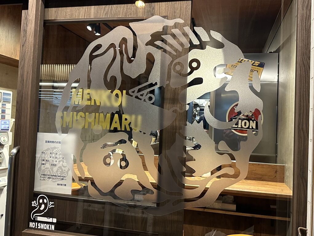 券売機上には玉を抱えた獅子。壁のハンガー掛けは獅子のフィギュア。入口のガラス戸には獅子をかたどった家紋。中には44○(シシマル)ガさりげなくデザインされています。