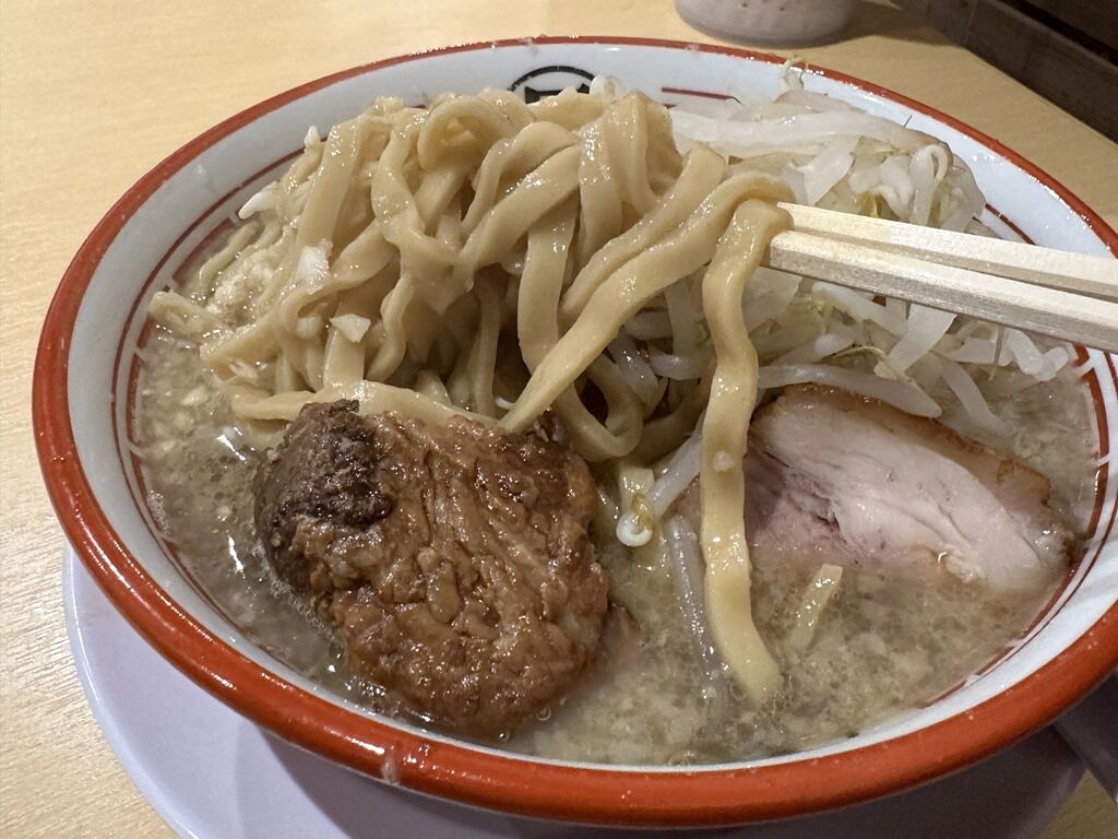 麺は平打ち極太縮れタイプ。丸山製麺製の様です。ごわごわ感ともちもち感を両立させたかのような秀麺。ど迫力の食べ応えで麺でもG系をたっぷり満喫できます。
