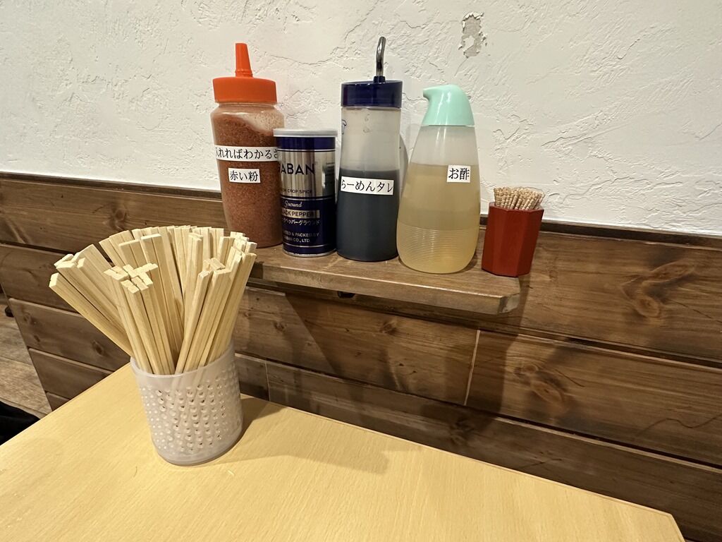BGMはJ-POP、Subtitle、新時代、クリスマスソング(back number)、KICK BACK、等♪箸は割り箸。卓上調味料は入れればわかるさ赤い粉(一味唐辛子)、GABANブラックペッパー、らーめんタレ、酢。