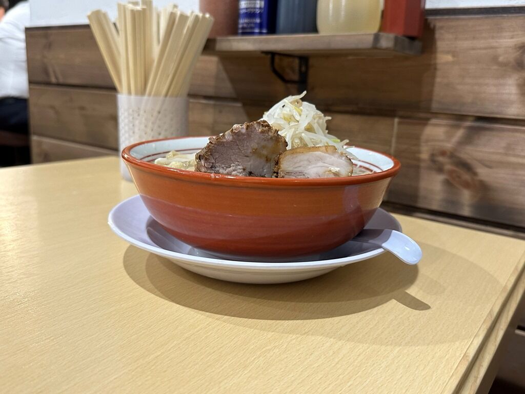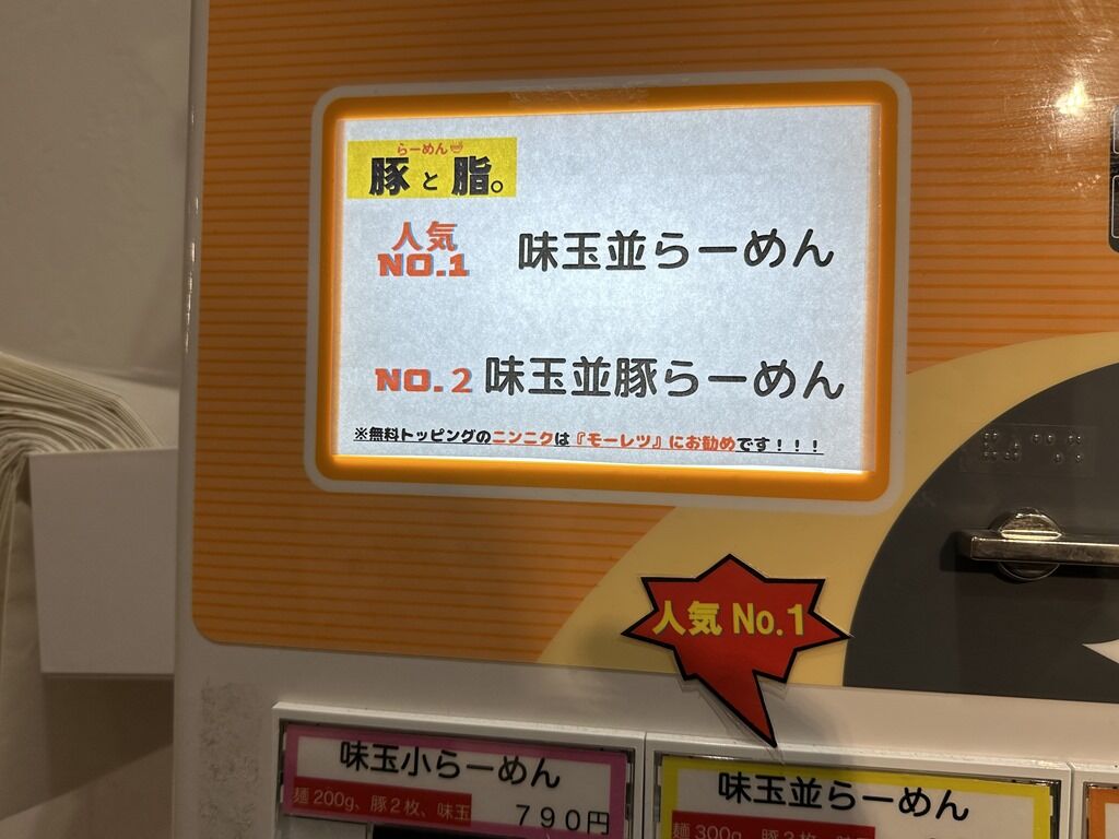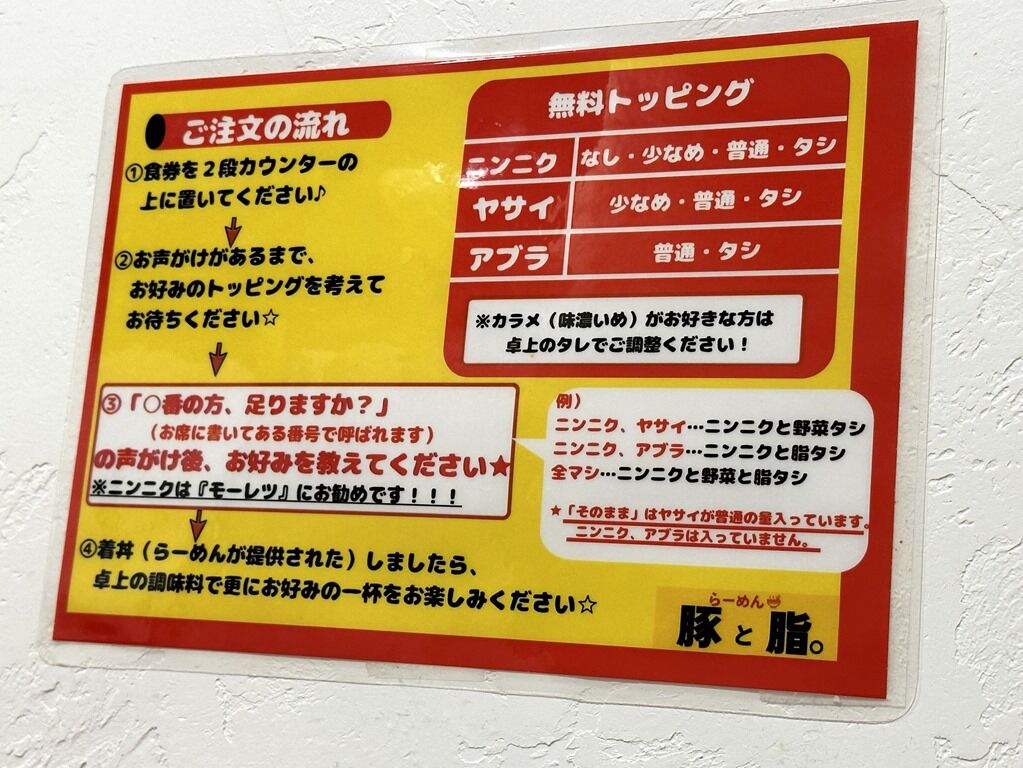 無料トッピングはニンニク、ヤサイ、アブラ。コールのタイミングは出来上がり直前「○番の方、足りますか?」の声がかかります。ただしテーブル席は食券回収時に確認。