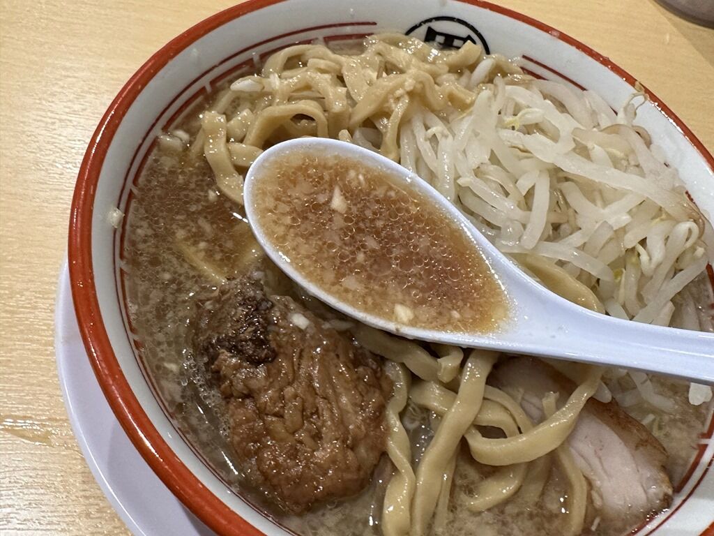 スープは豚出汁が存分に溶出した豚骨醤油味。提供直後がベストバランスでまさに極上の味わい。修行先に勝るとも劣らない、これぞ二郎系と言いたい骨太な一品。ただ、中盤から後半にかけて尻上がりにしょっぱくなるのがちょっと惜しい点。まあカラメ好きなら無問題かと。人気YouTubeの影響だけじゃない、確かな味と思いのたけが詰まった一杯ですごく美味しい!