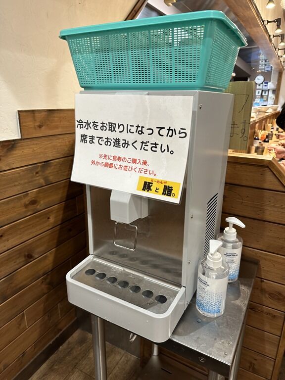 店内は厨房前に真っ直ぐなカウンター8席、奥に4人卓x1、2人卓x1。パーティションは無し。消毒液は給水機横に配置。紙エプロンは券売機横に用意。順番の関係で2人掛けテーブル席へアサイン。