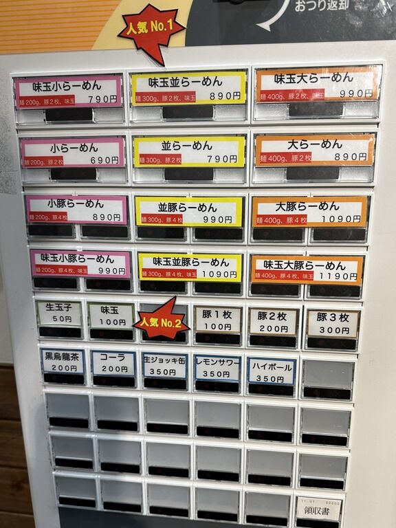 主なメニューは、小らーめん690円、並らーめん790円、大らーめん890円、他。麺量は小200g、並300g、大400g。らーめんは豚2枚、豚らーめん+100円は豚4枚。